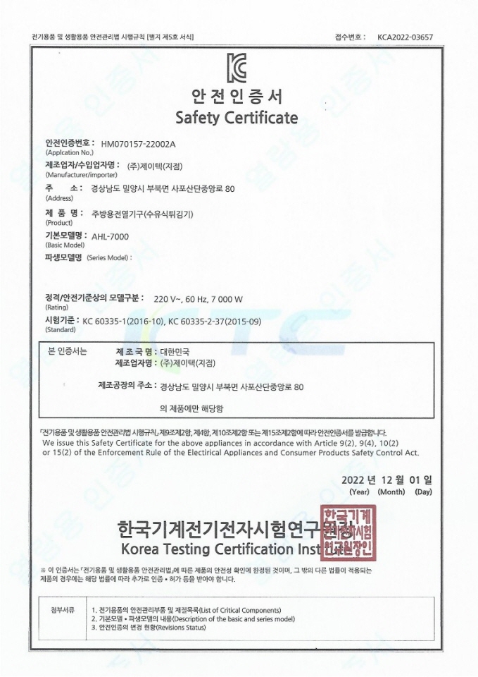 또한 전 세계인의 건강을 위해, 폐암 유발 물질인 ‘조리흄’으로 구성된 유증기는 물론 ‘트랜스 지방’ 및 1급 발암물질 ‘벤조피렌’ 등 유해 성분을 최소화하여 전 인류 건강의 밀알이 될 것을 약속드리며, 당사가 제작한 기계는 처음부터 끝까지 책임진다는 신념과 각오로 고객 여러분께 정성껏 보답하겠습니다.